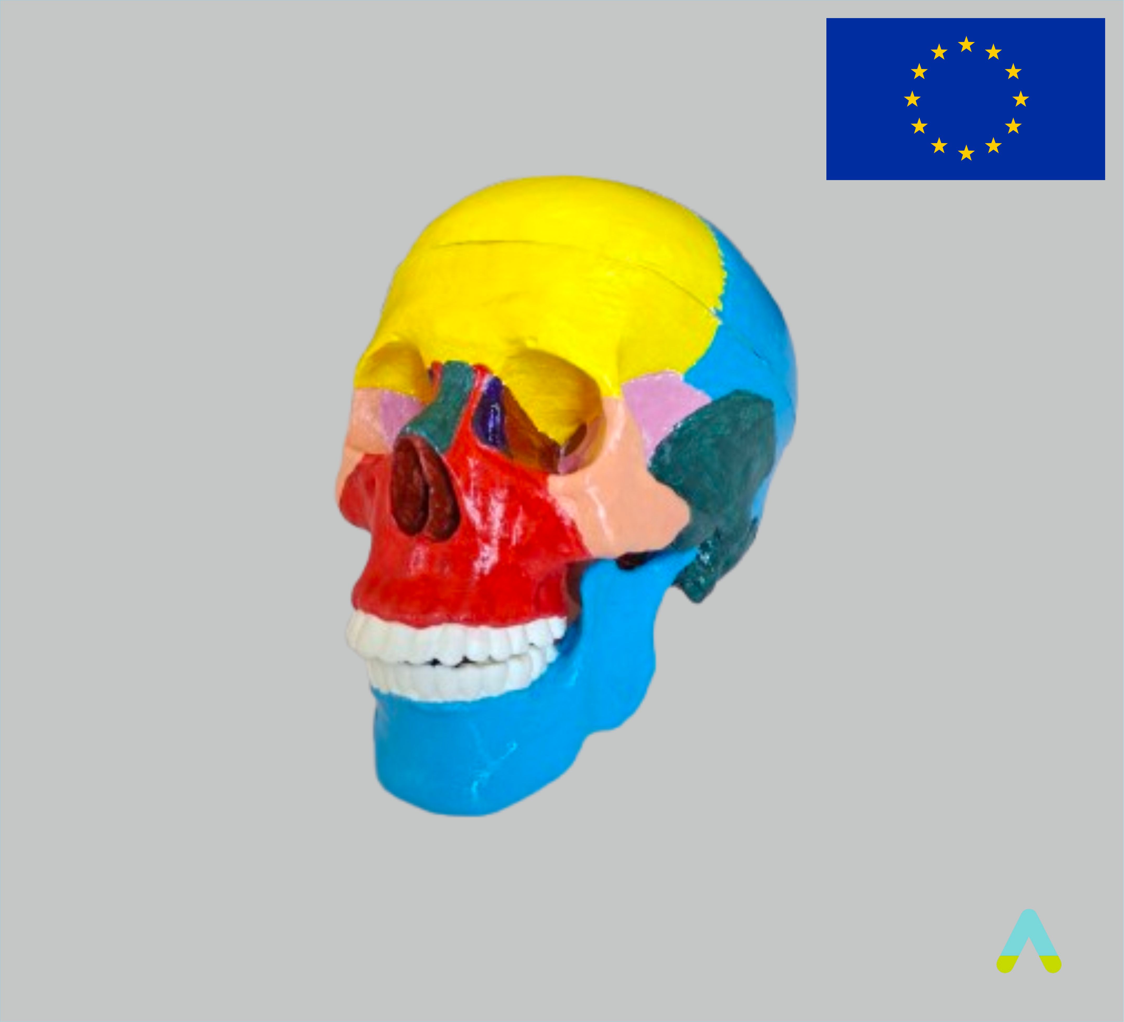 Модель створена для демонстрації на уроках біології для проведення контрольних, лабораторних робіт, а також усних опитувань при вивченні розділу «Людина». Кістки черепа позначені різними кольорами, що дозволяє розрізняти їх межі.