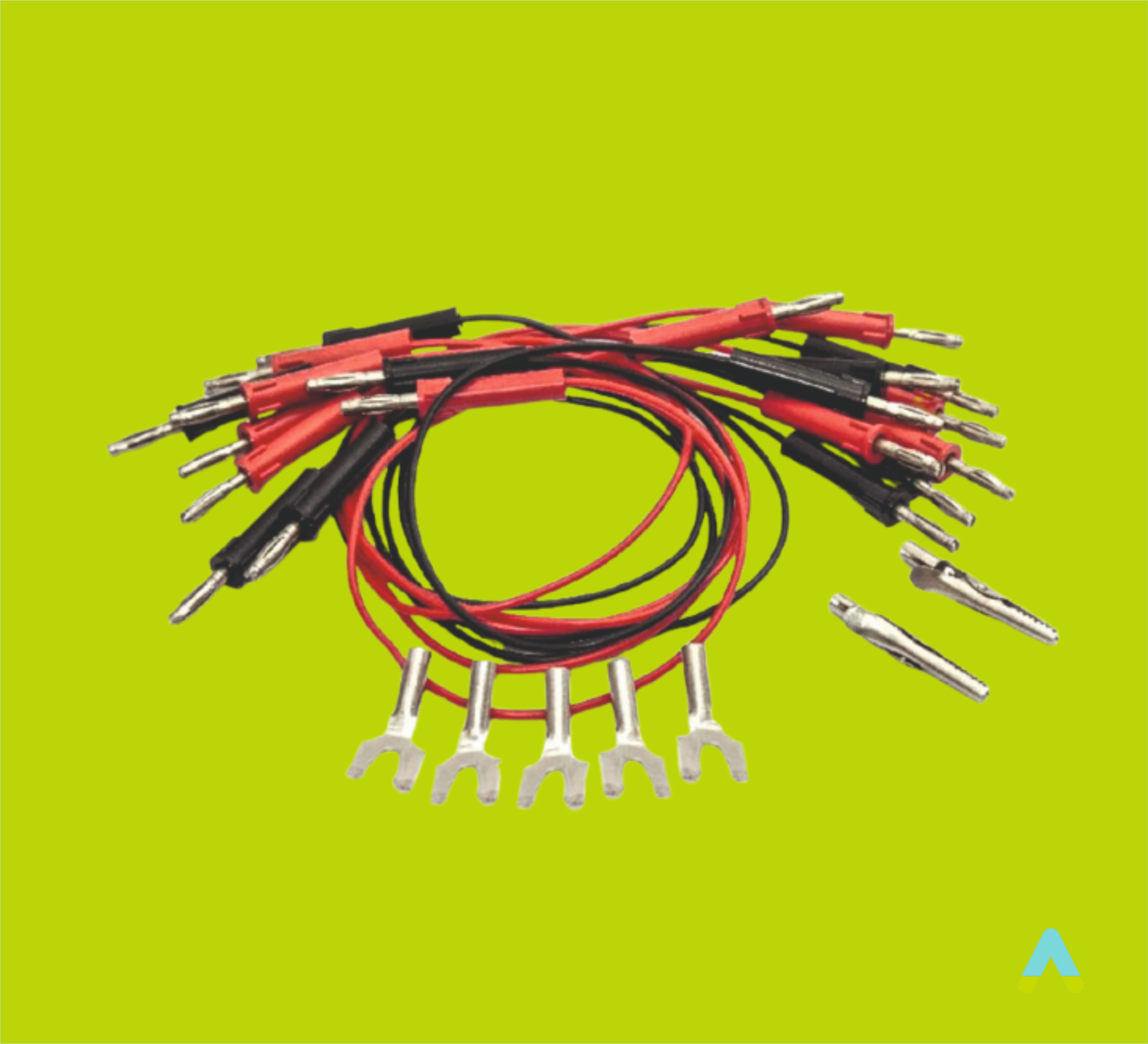 Набір провідників в ізоляції: багатожильна мідь перерізом від 1 мм кв., загальна товщина від 3 мм, наконечник типу "банан" з можливістю приєднання іншого провідника з торцевої сторони.